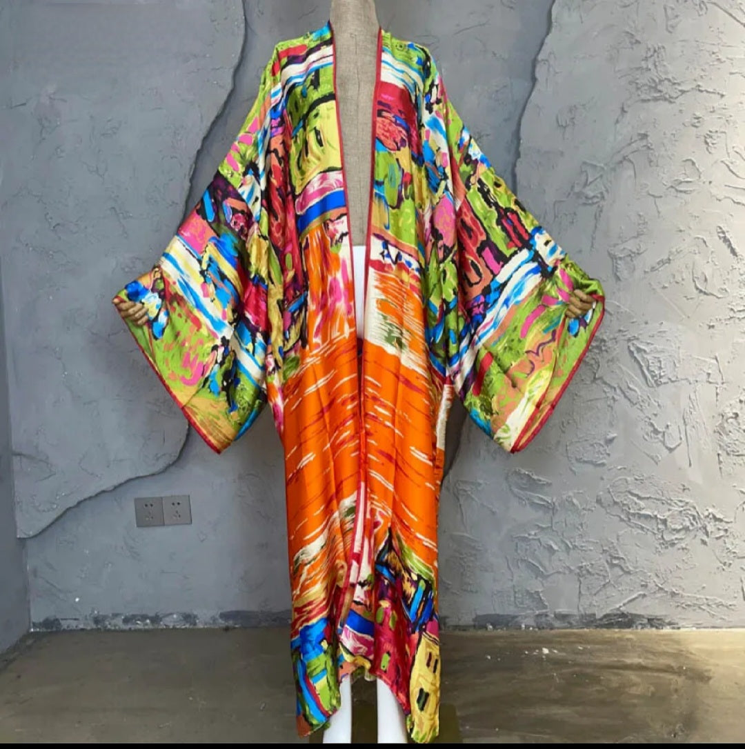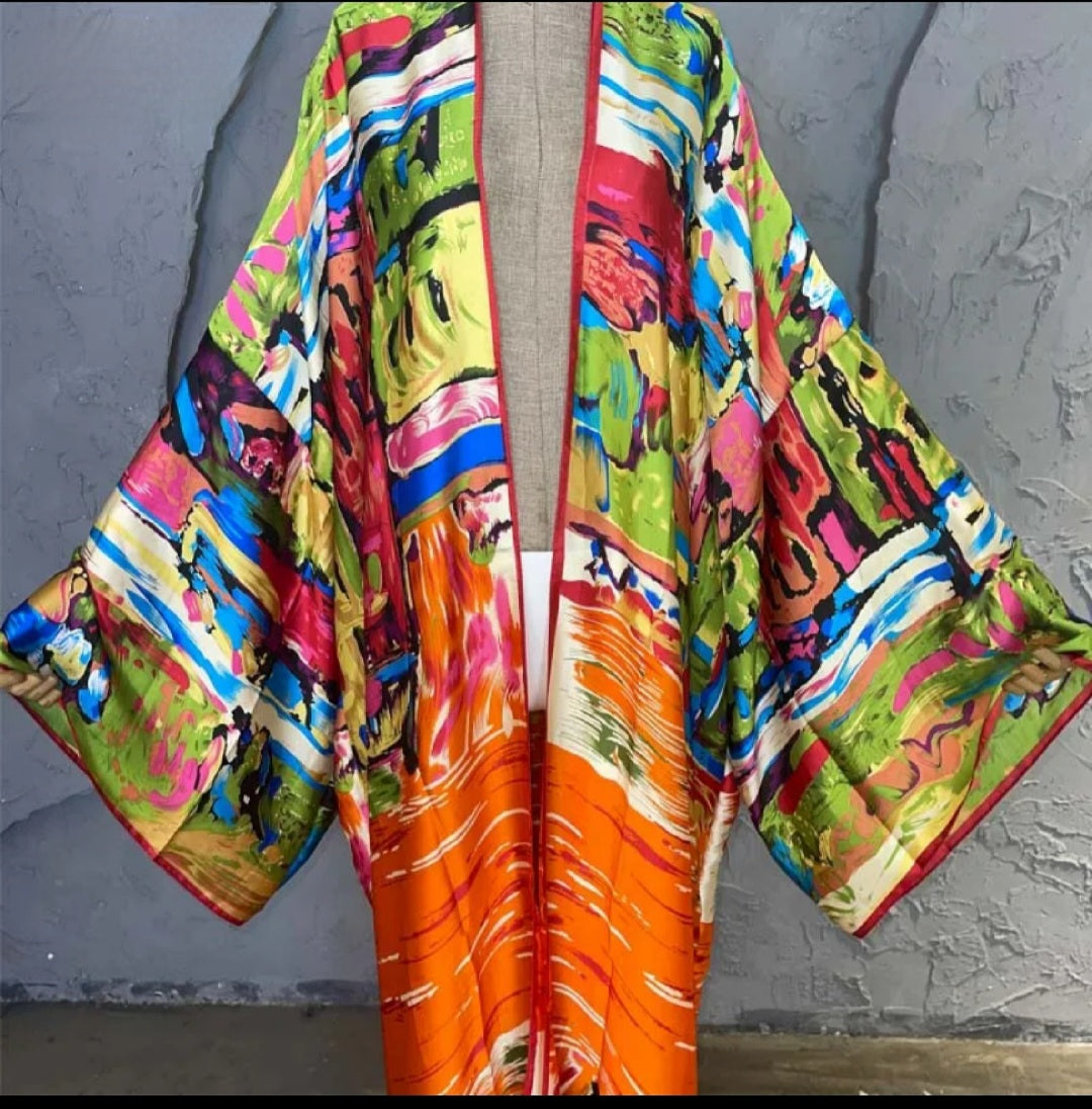 Gorgeous satiin feel kimono. Wide sleeves, open style. Perfect for vacay or everyday wear to the beach, poolside, brunch and dinner. Style this light weight flowing duster with shorts, swimsuits, bodysuits, mini skirts, jeans or dresses. The styling possibilities are endless.