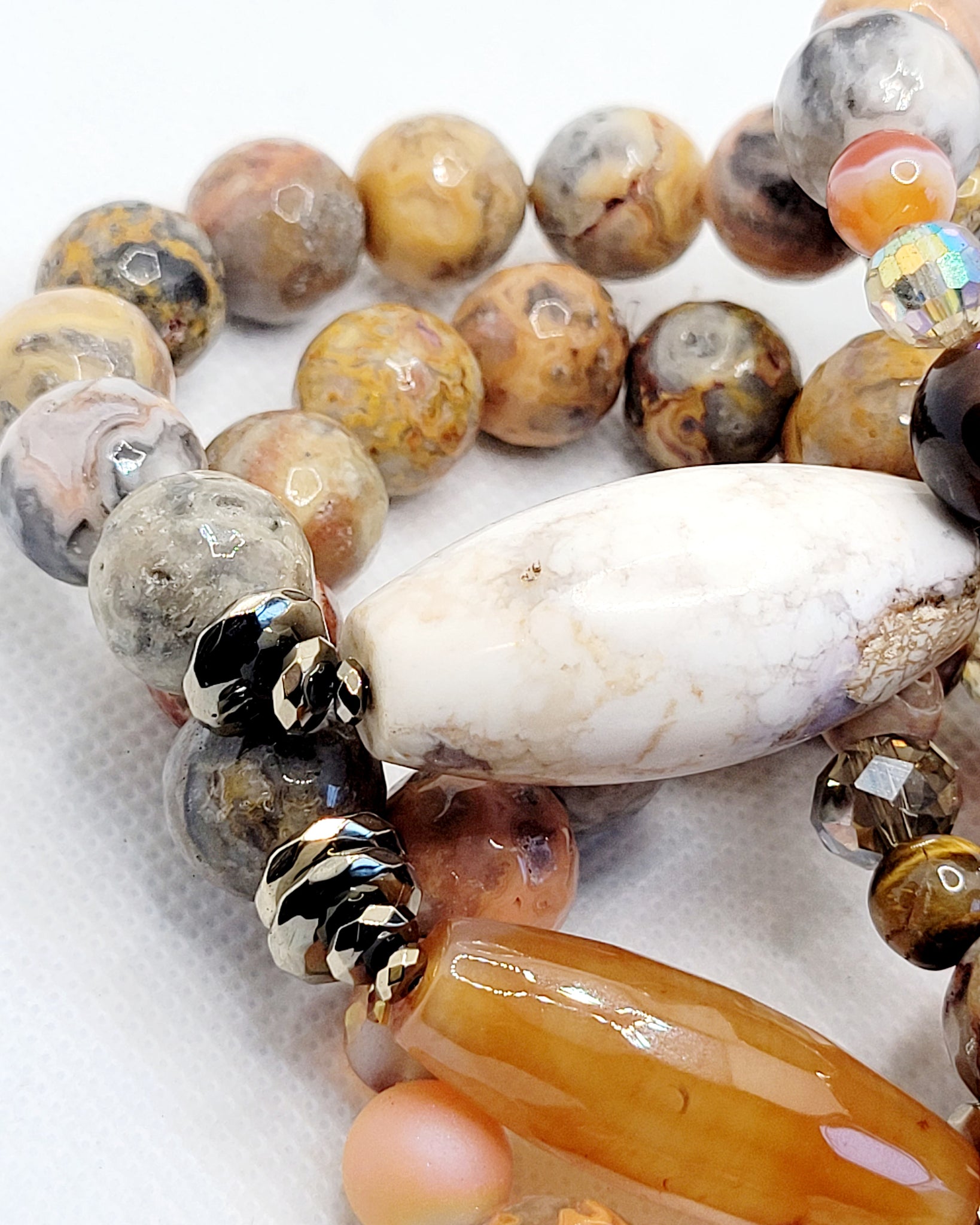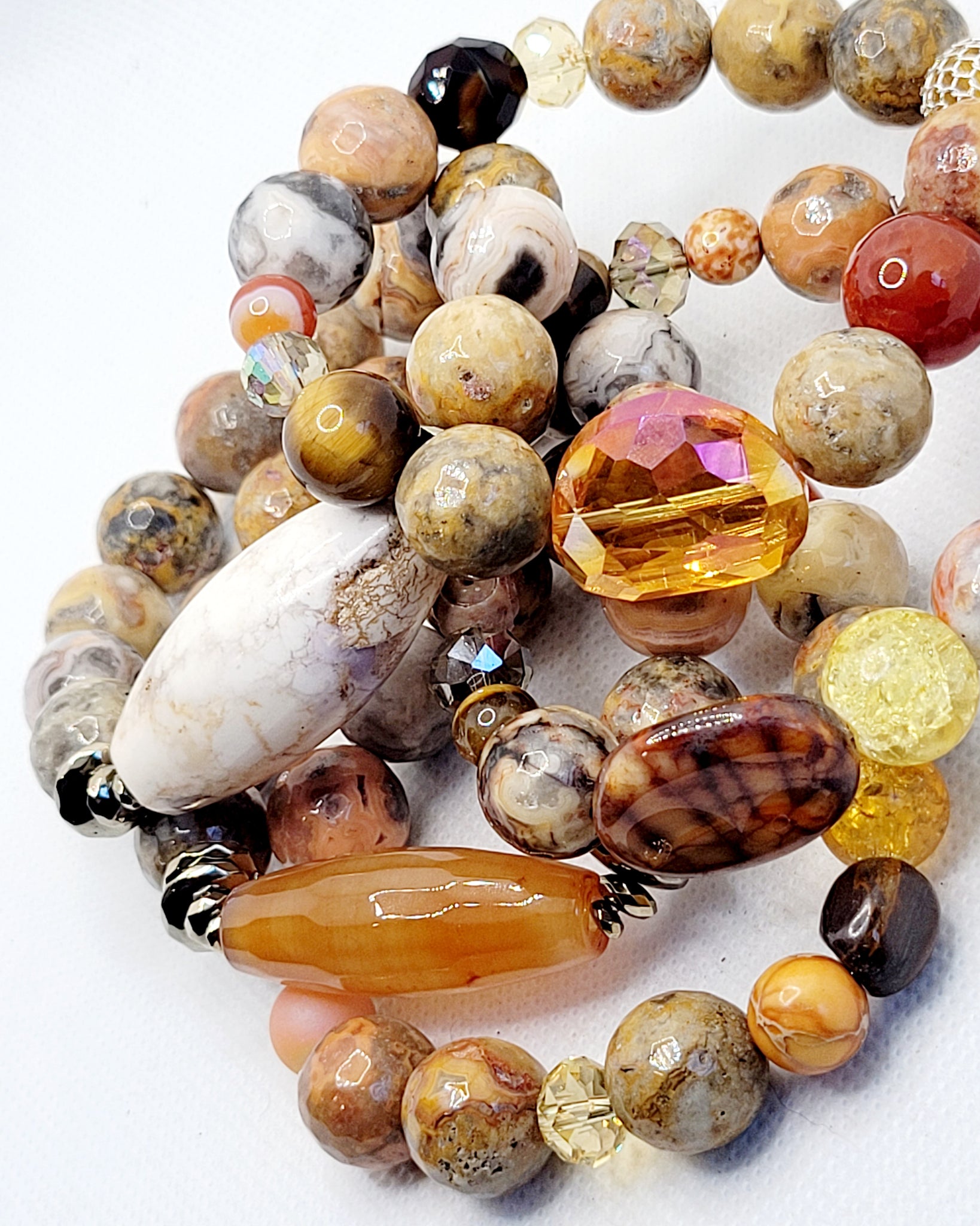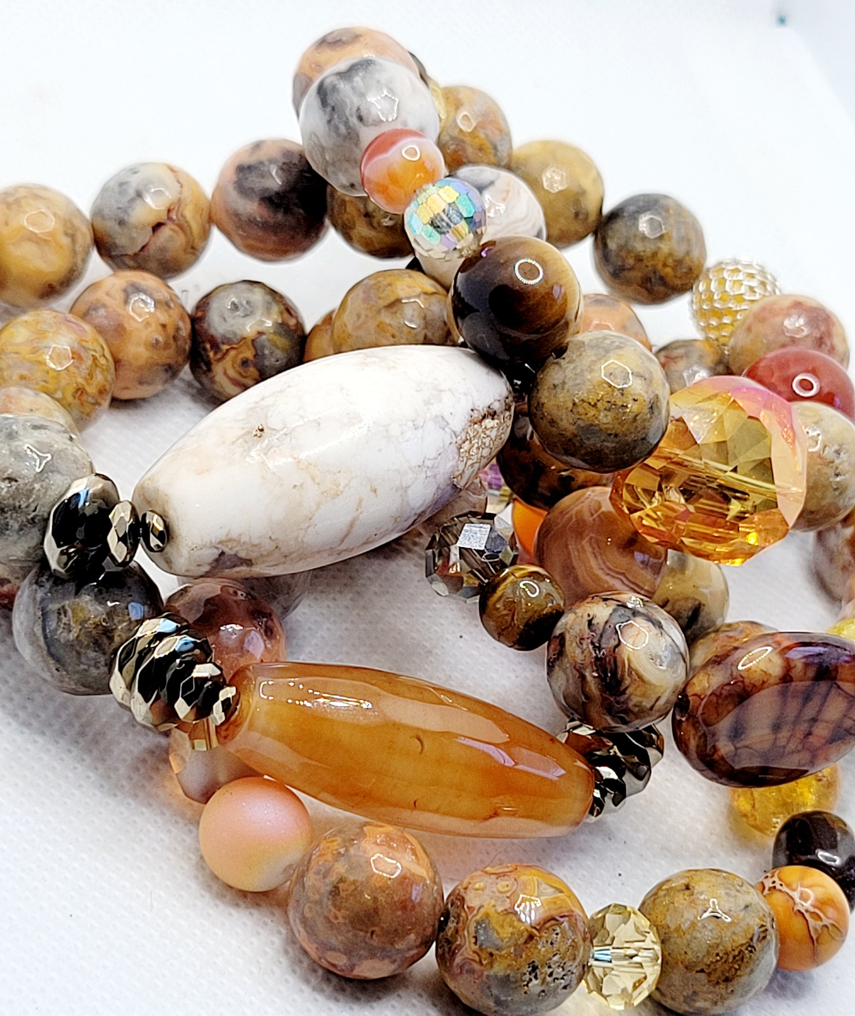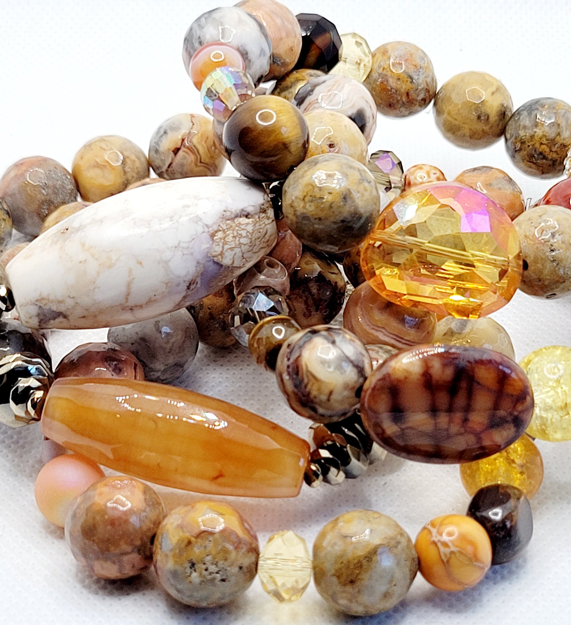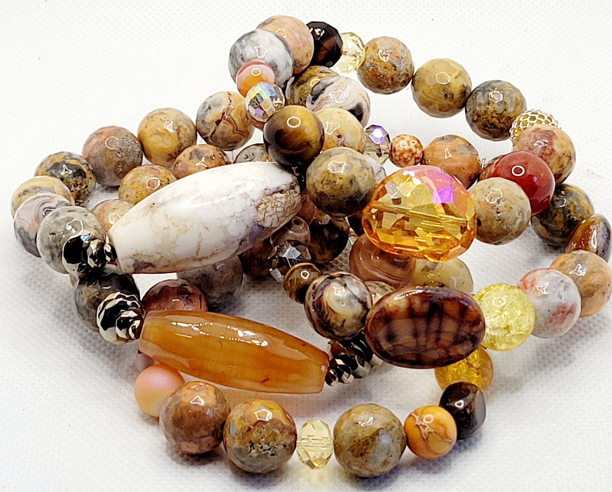 All Natural Is A Stack Of 5 Bracelets Created Using Crazy Lace Agates & Topaz, Blown Glass & Crystals...Beads Range From 4mm-14mm