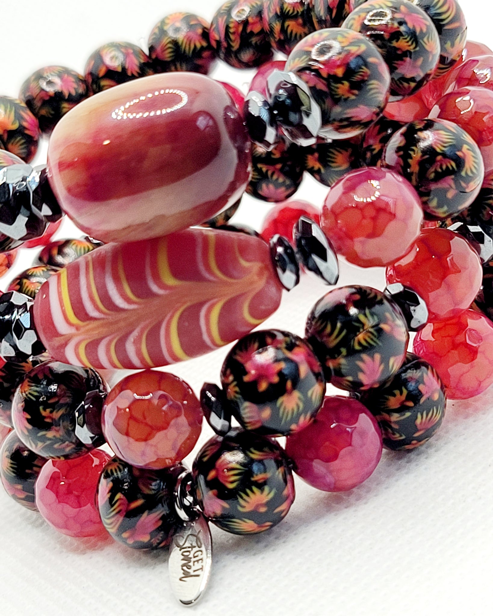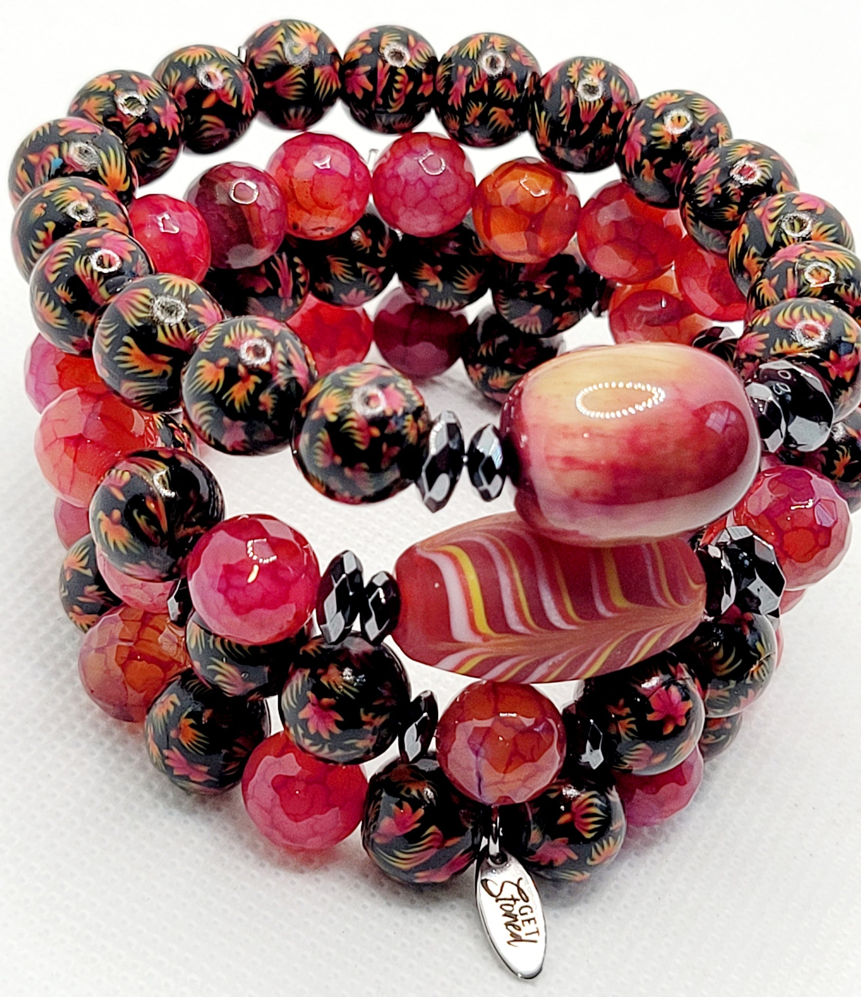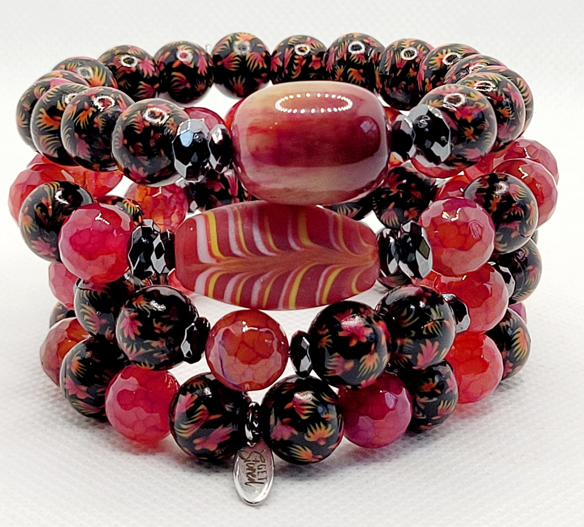 This Stack Of 4 10mm Is Created Using Cracked Agate & Handmade Clay Beads With Unique Flowers Resembling Daisies Etched In Them.