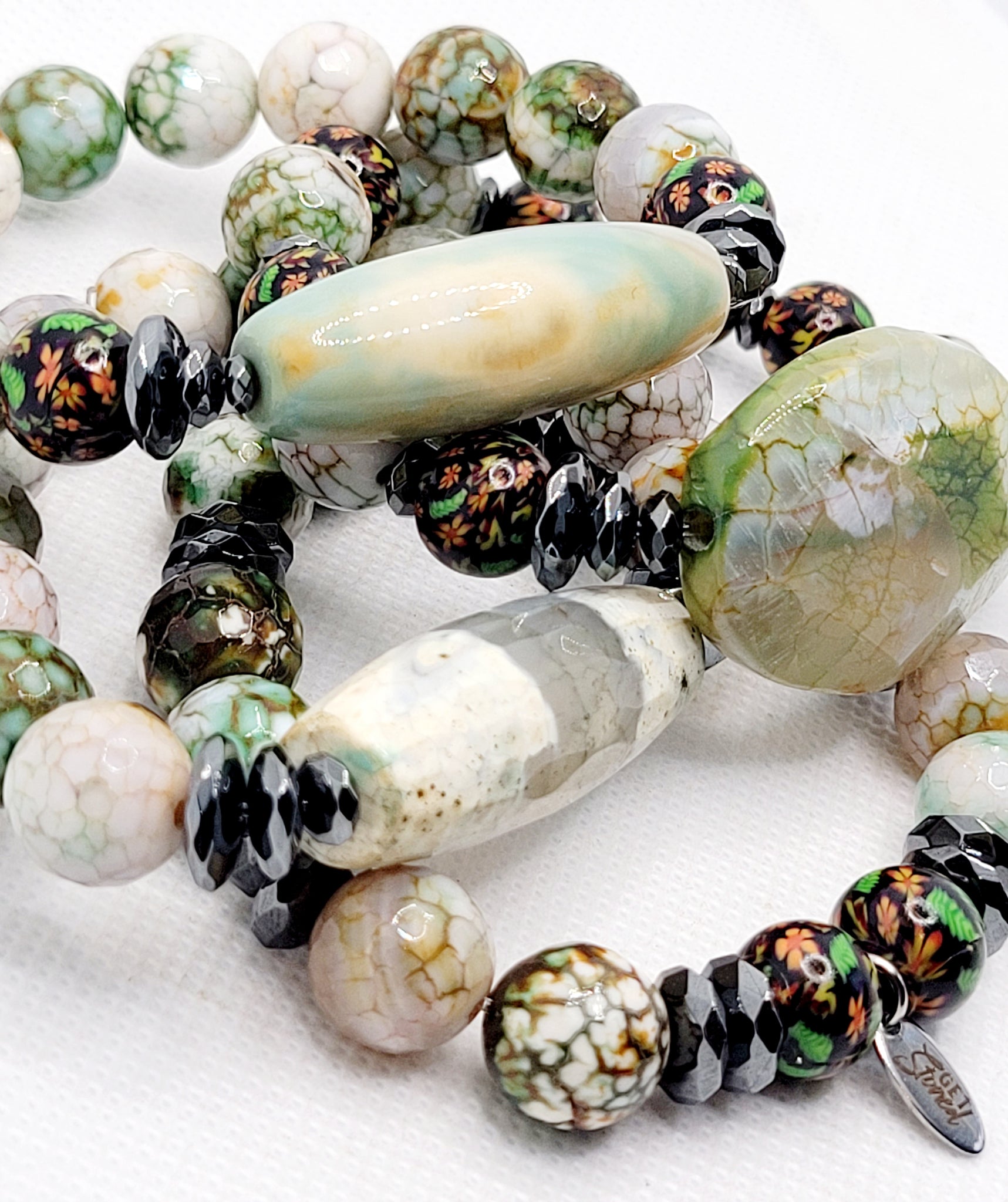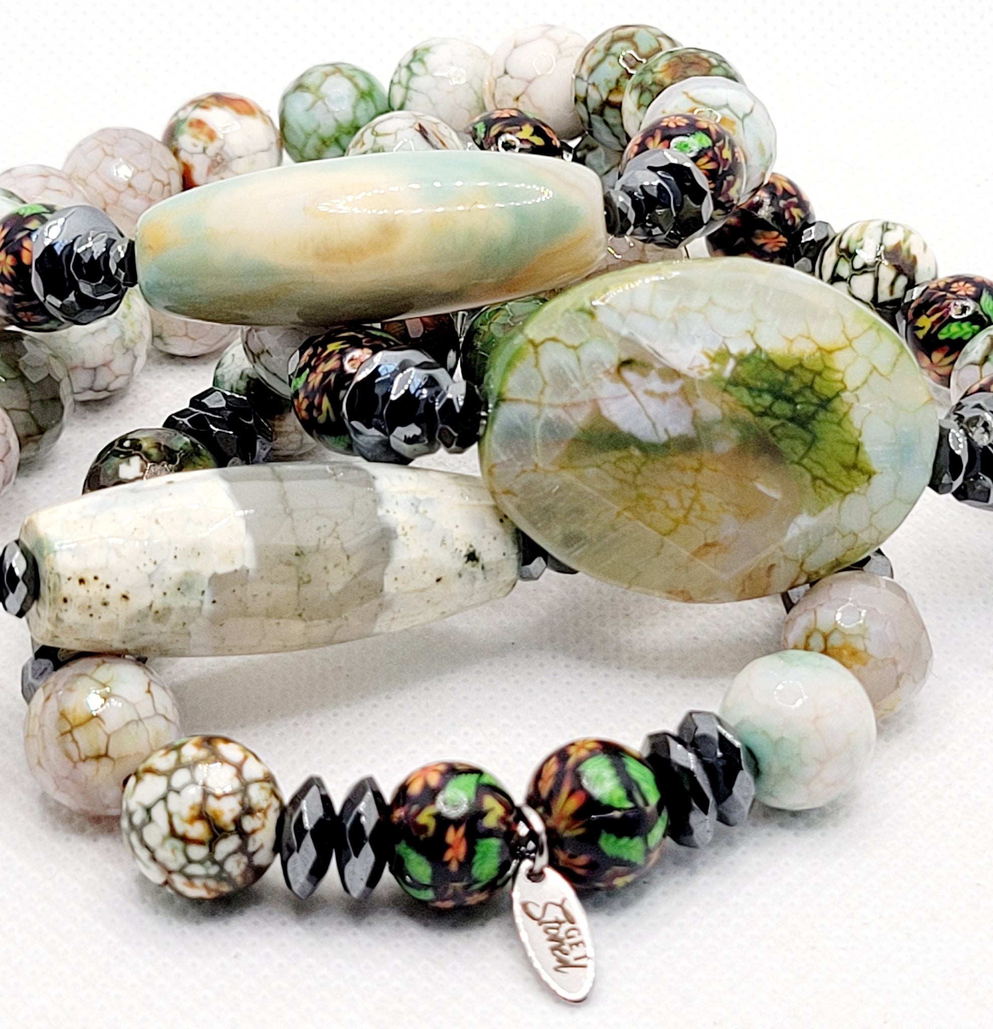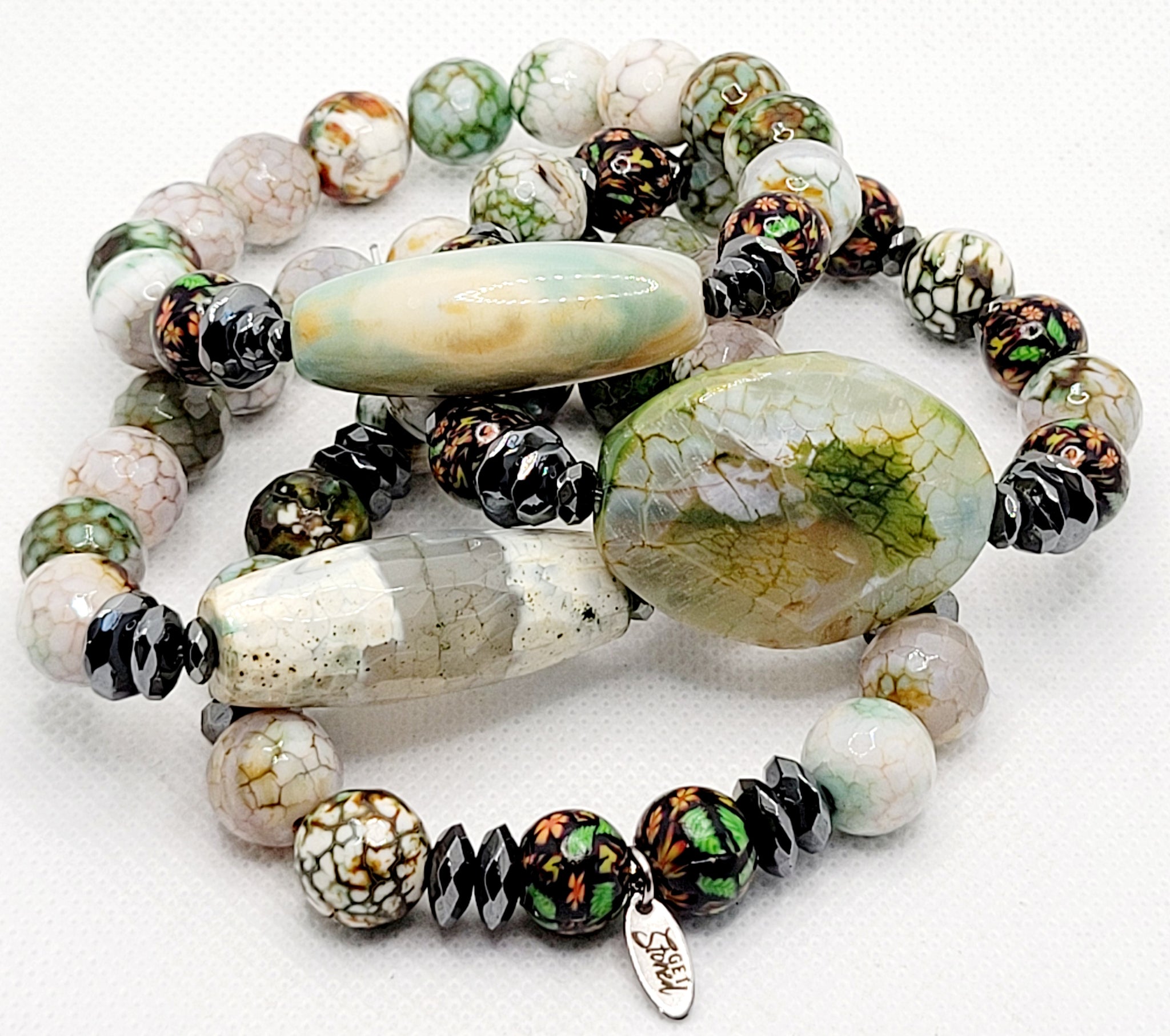 Are You Ready For This Summer Green?? This Stack Of 4 Is Made Of 12mm Fire Agates & 10mm Handmade Clay Beads With Spring Flowers Etched In Them.