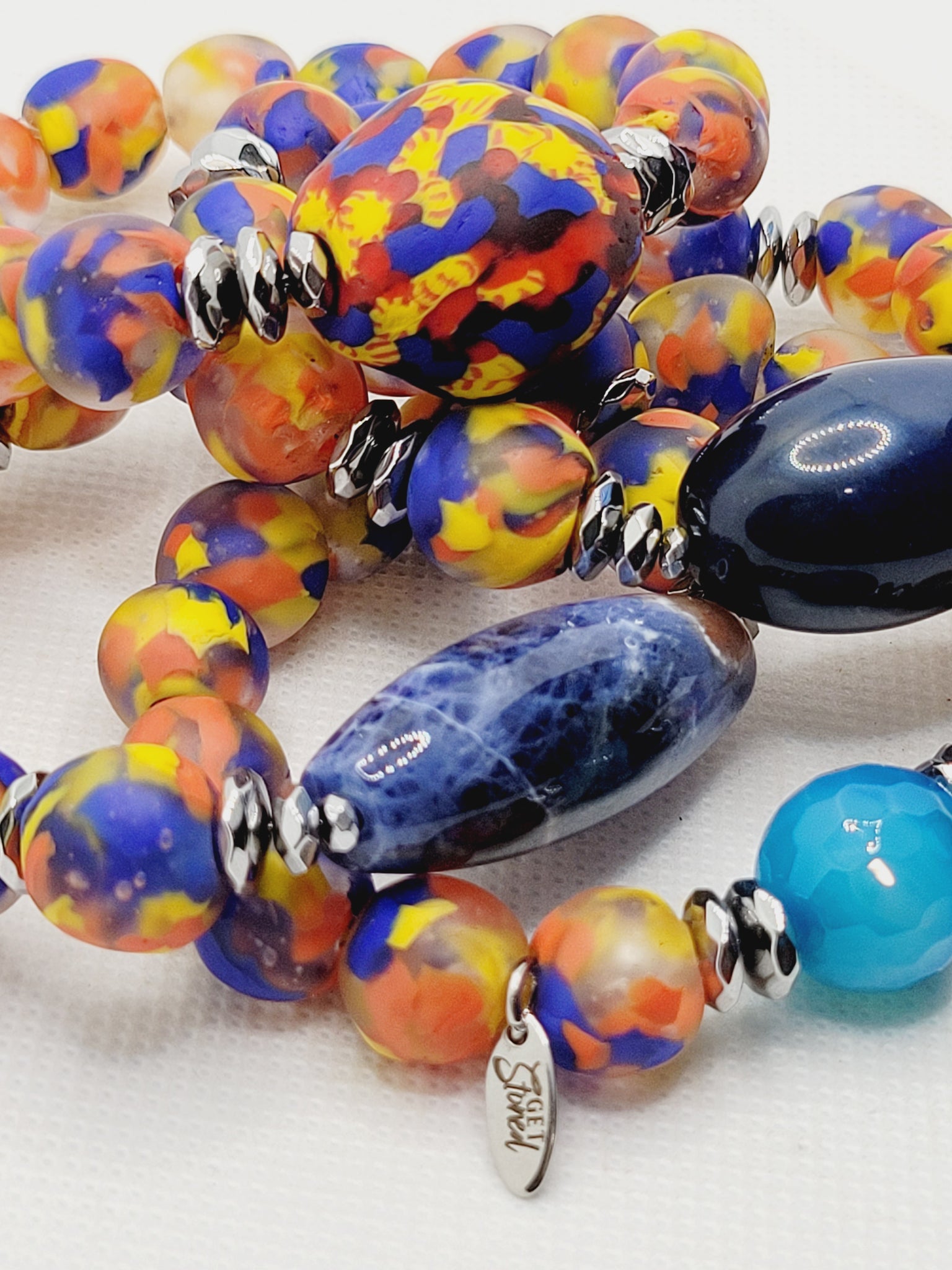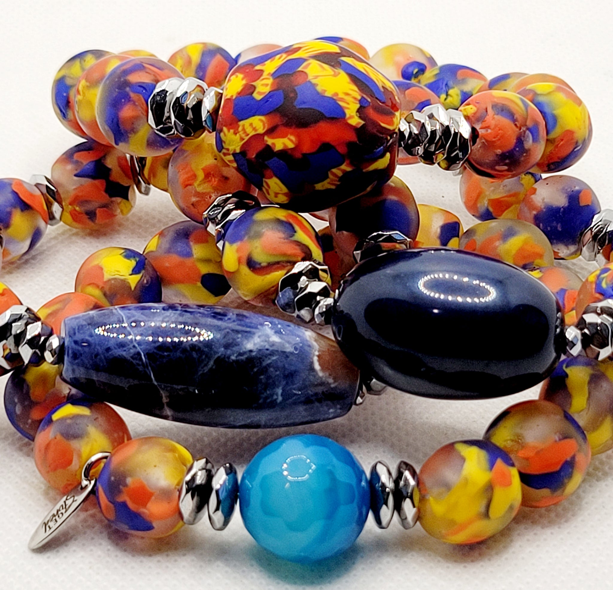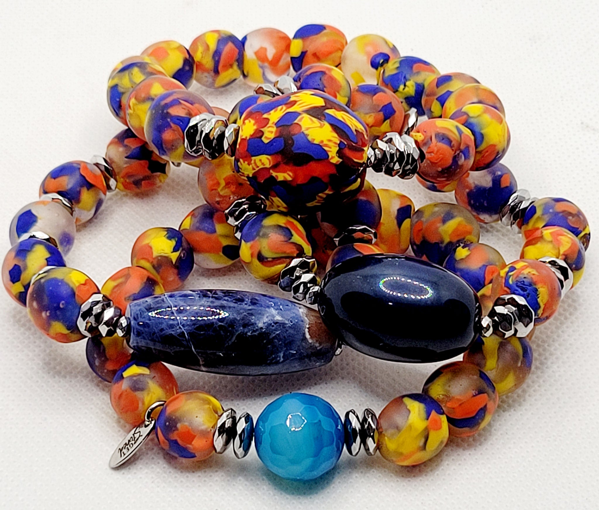 Stack Of 4 13mm Multi Colored African Glass Beads Adorned With Blue Accents