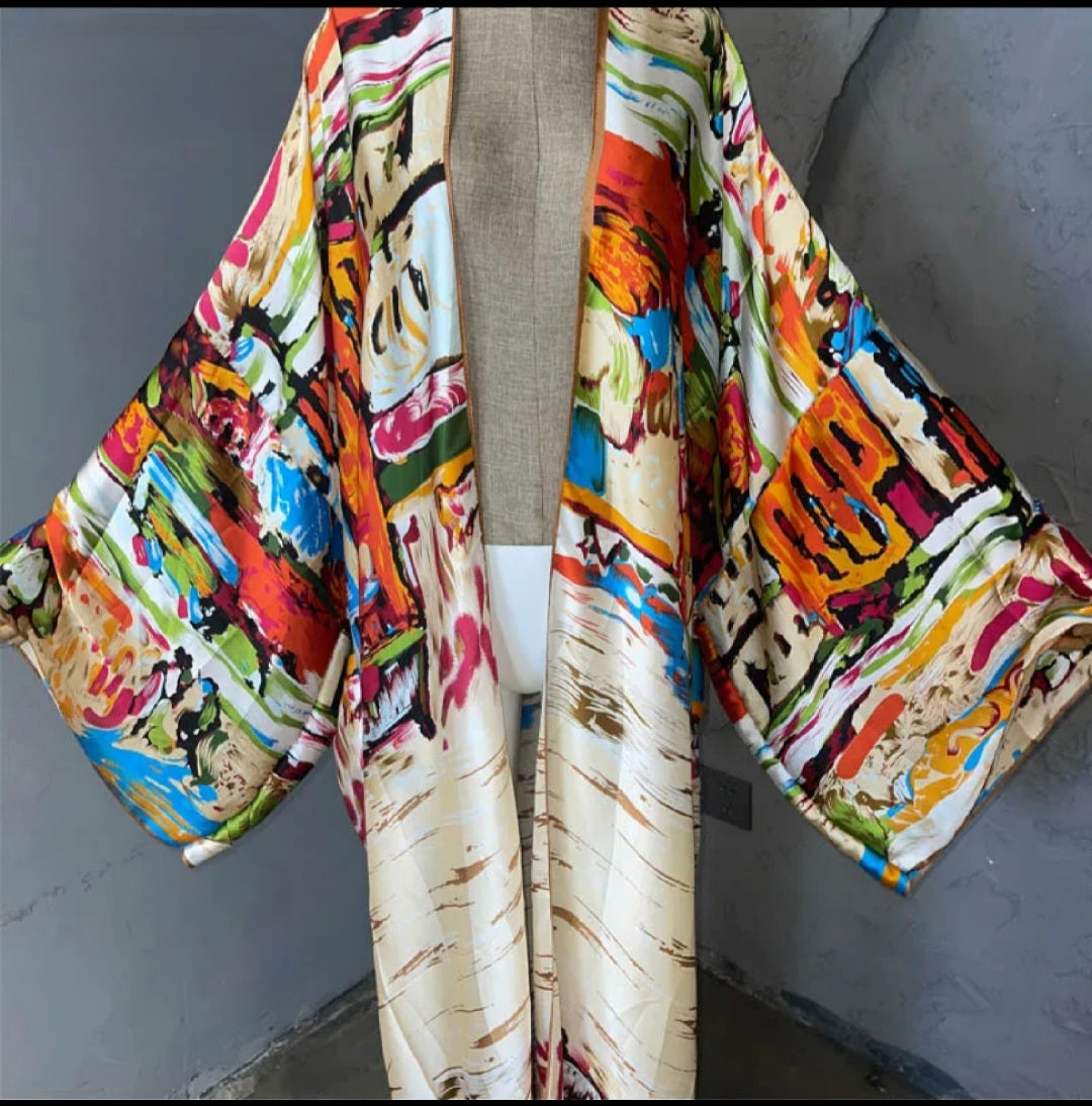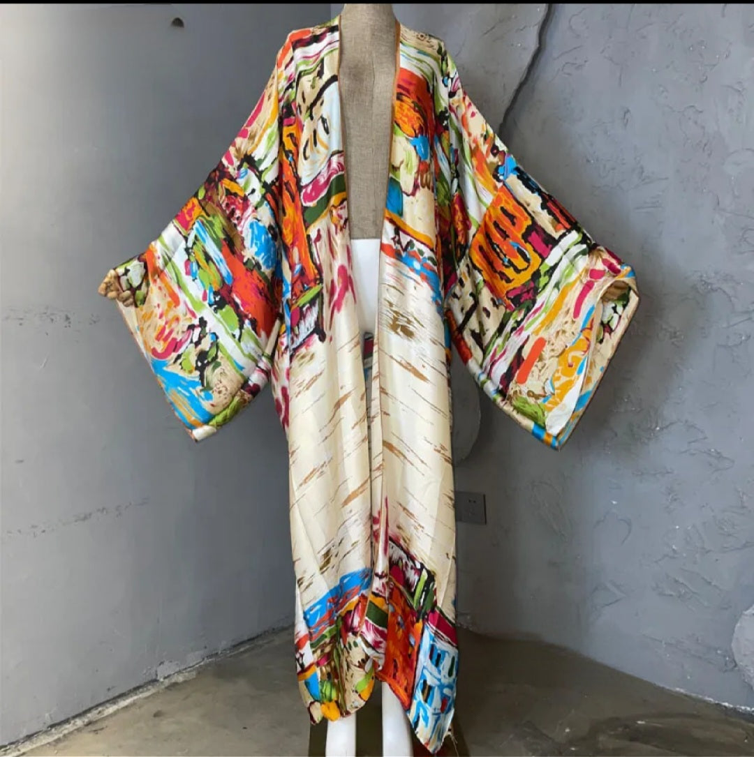 Gorgeous satiin feel kimono. Wide sleeves, open style. Perfect for vacay or everyday wear to the beach, poolside, brunch and dinner. Style this light weight flowing duster with shorts, swimsuits, bodysuits, mini skirts, jeans or dresses. The styling possibilities are endless.