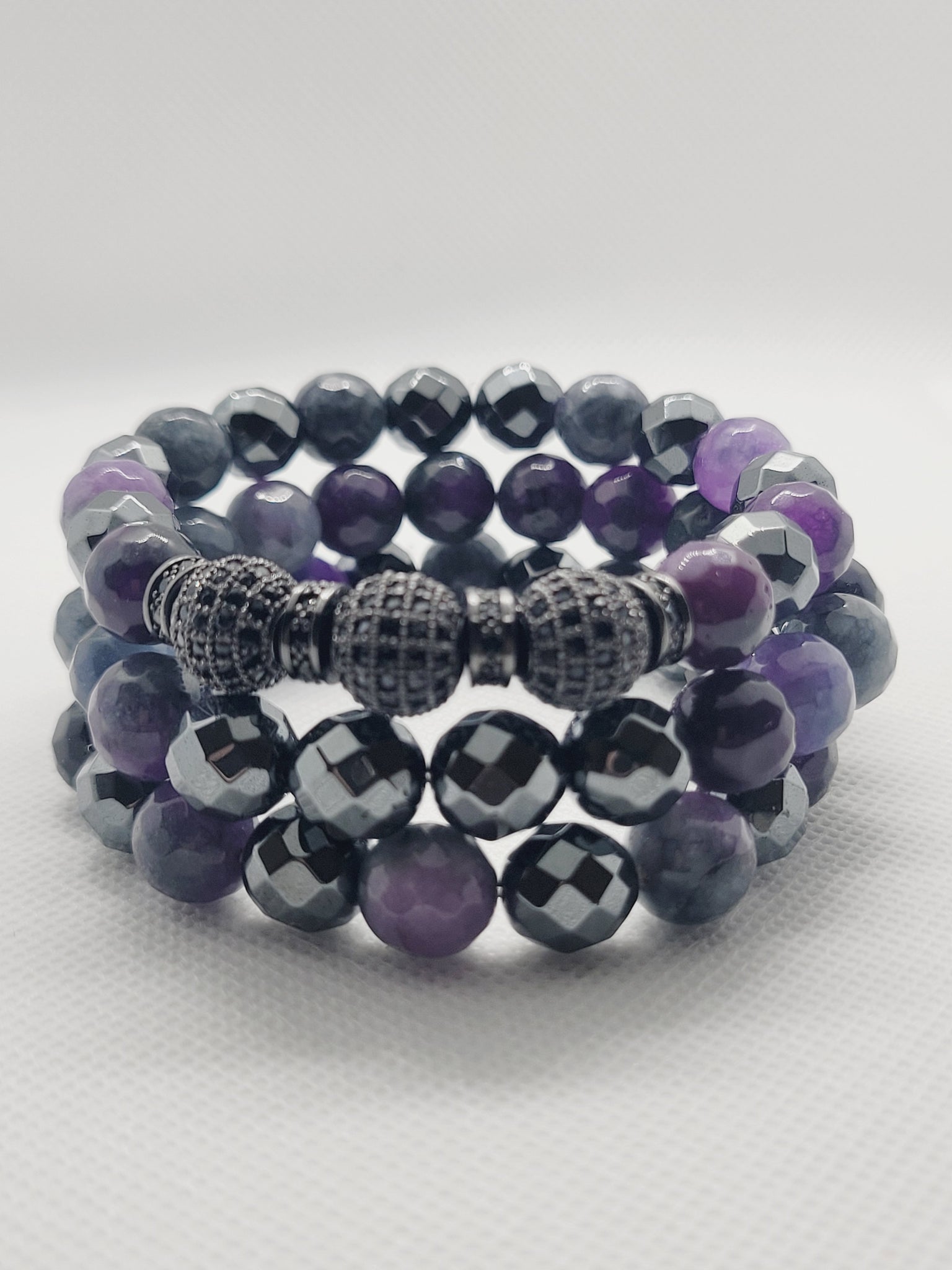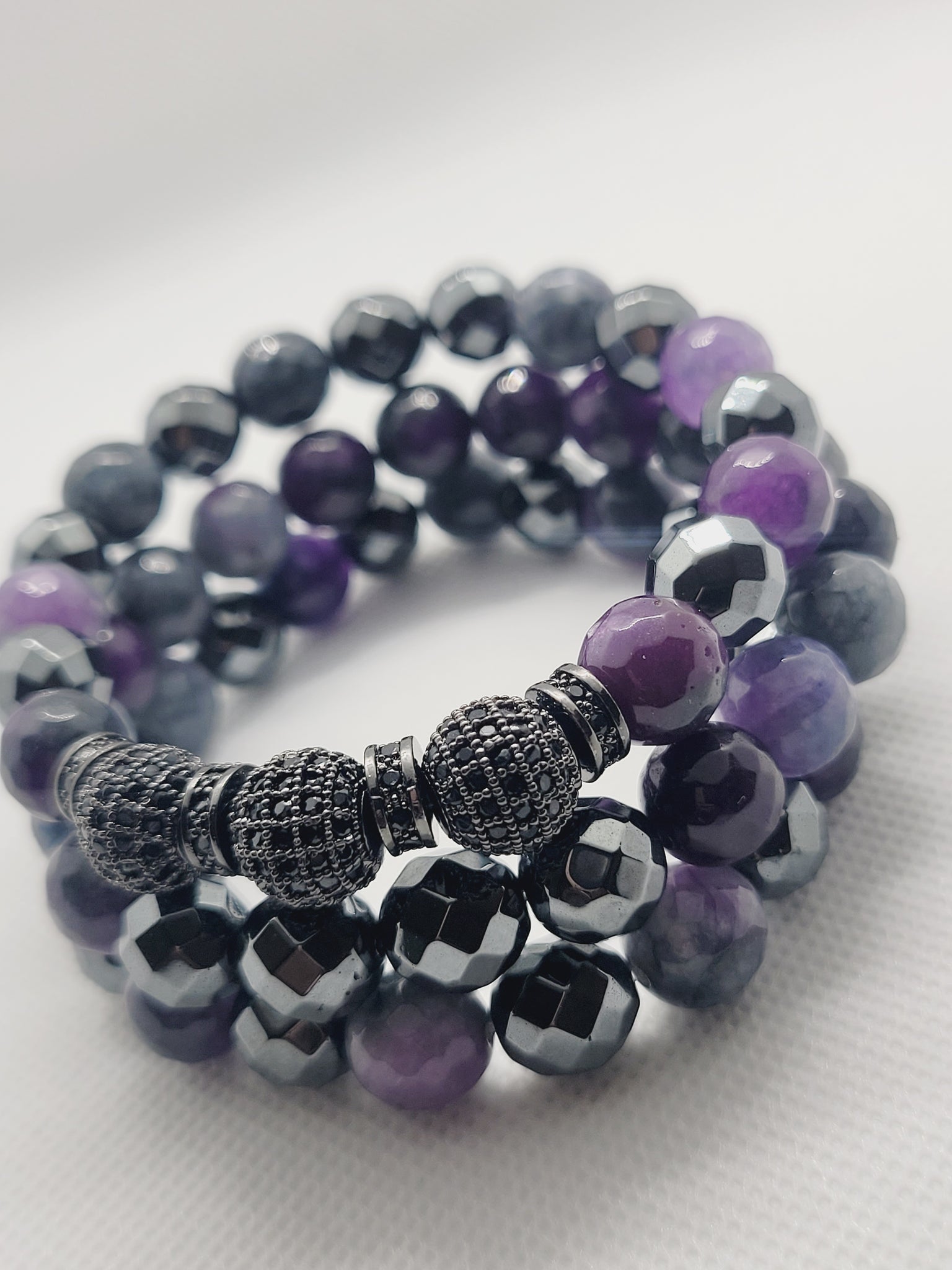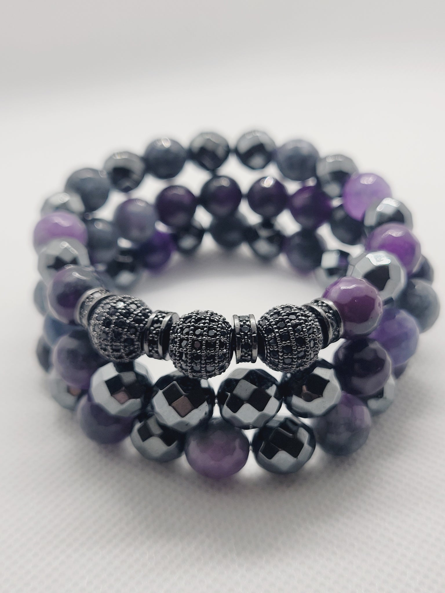 10MM MIXED PURPLE AGATE STACK MIXED WITH BLACK FACETED HEMATITE AND CUBIC ZIRCONIA