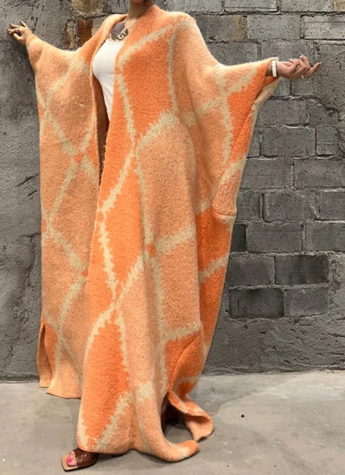 This gorgeous brushed cardigan is a must have. A stylish thick and warm layering piece. A fuzzy texture with a colorful bold diamond abstract print, open front, side slits. Wear this piece over any bottoms for an instant upgrade..