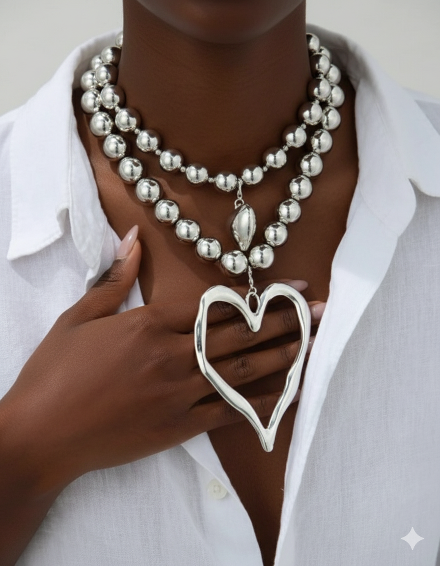 2pcs/Set Bohemian Style Exaggerated Large Bead & Faux Pearl Handmade Beaded Hollow Heart Alloy Pendant Necklace, Lightweight Luxury Fashion Necklace