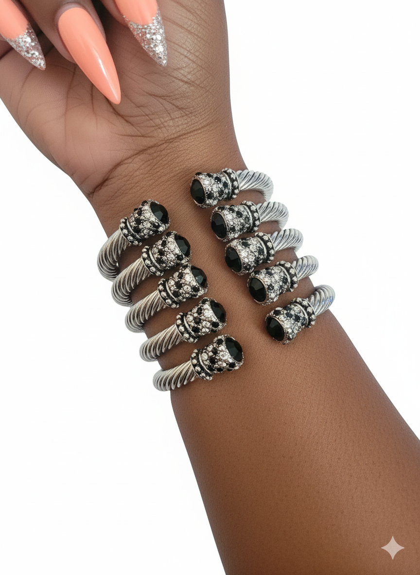 Get Stoned Cable Rope Stainless Steel Bangles Are Here! Time To Add A Little Metal To Your Look! They are very light to wear and will fit up to a 8 1/2 inch wrist. These are adjustable and can be adjusted out to fit a 9 inch wrist without compromising the style.